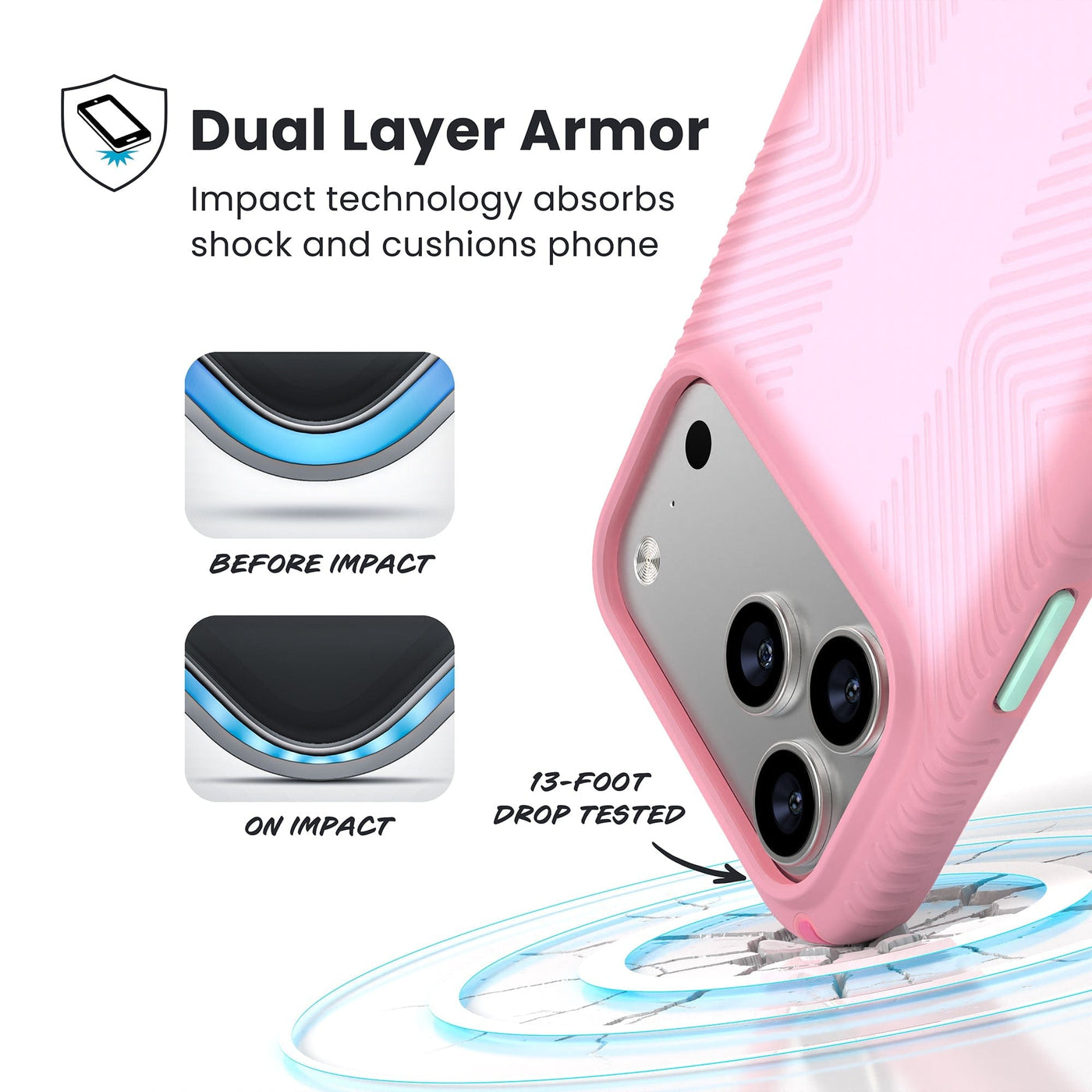 A corner of the case impacts the ground - a diagram shows interior cushion of phone before impact and on impact. Text reads Dual Layer Armor: Impact technology absorbs shock and cushions phone; 13-foot drop tested