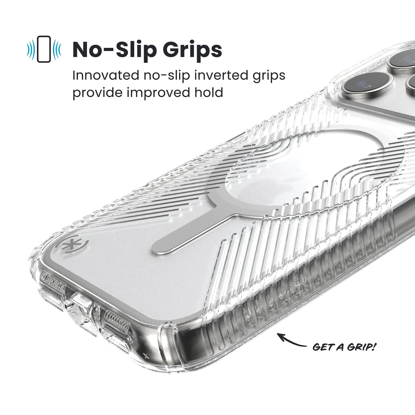 Close-up of grips on the back and side of a phone case. Text reads No-Slip Grips: Innovated no-slip inverted grips provide improved hold; Get a grip!