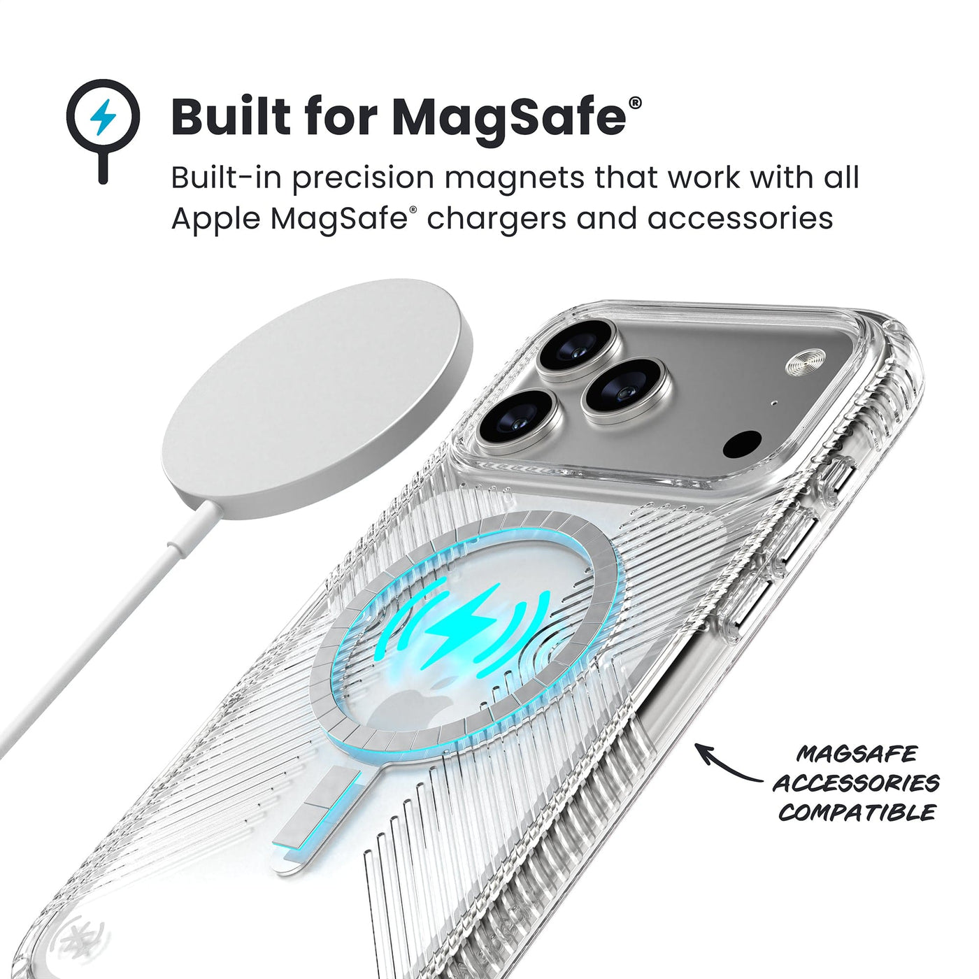 A MagSafe charger hovers over the back of the phone case. Text reads Built for MagSafe: Built-in precision magnets that work with all Apple MagSafe chargers and accessories; MagSafe accessories compatible